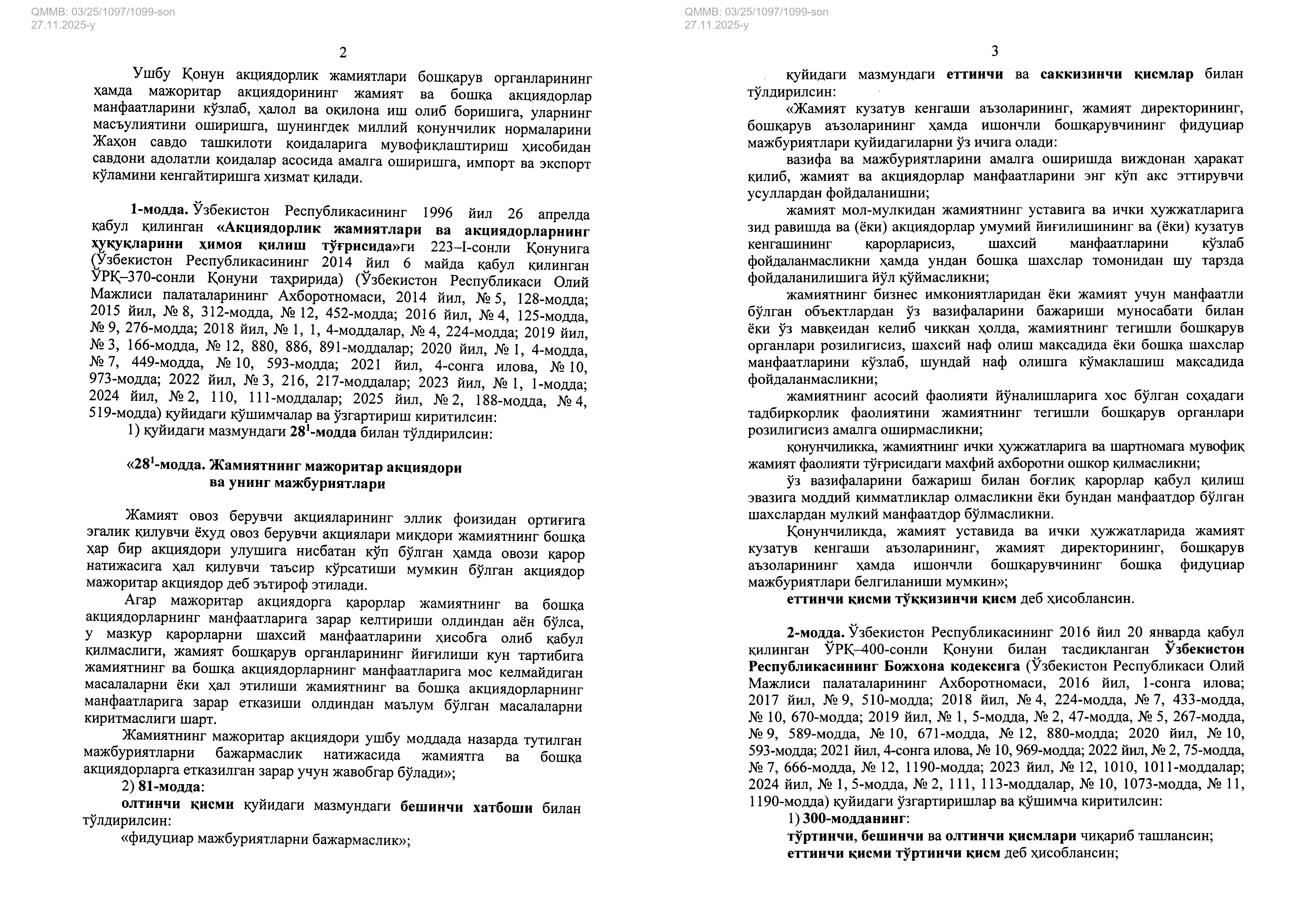 📜✍🏼 27 ноября Президент Узбекистана подписал Закон №ЗРУ-1097, внёсший изменения и дополнения в Закон «Об акционерных обществах и защите прав акционеров» и Таможенный кодекс.