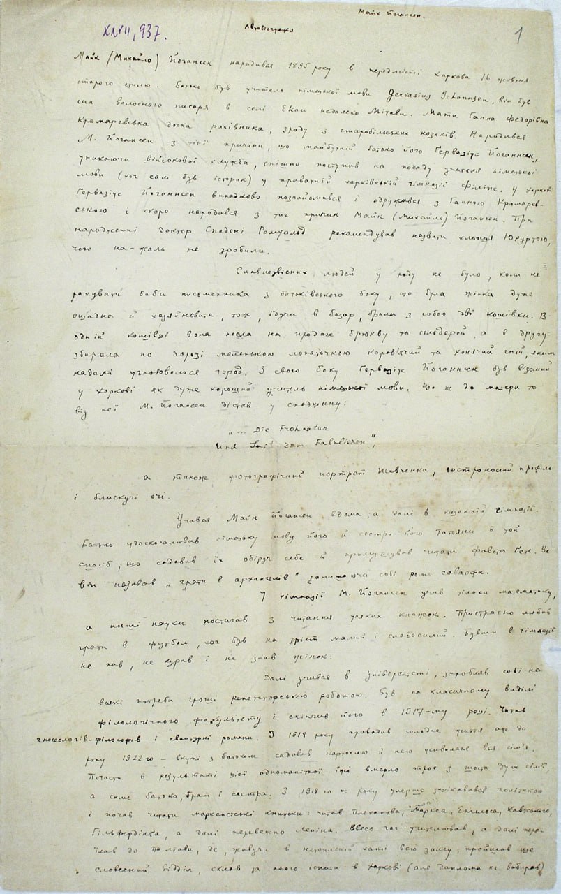 Тут мало бути його одиноке прижиттєве відео Йогансена, але раптом з’ясувалося, що не вся прогресивна громадськість святкує нині його ювілей. Нібито на Вікіпедії написано рік народження 1896. Перевіряла — ні, таки 1895. А проте відео буде згодом, а сьогодні уривок з автобіографії Майка Йогансена, яку він написав для літературознавця Миколи Плевака не пізніше 1930 року, а опублікував її вперше учень Йогансена, літературознавець Степан Крижанівський аж 1989 року.