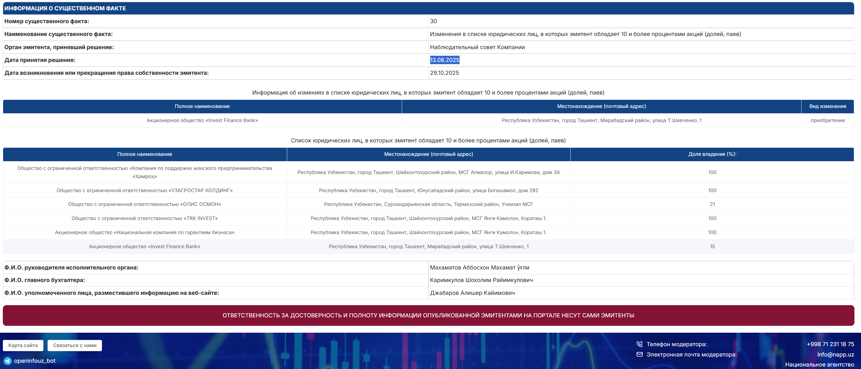 Напомним, что 15 мая 2025 года простые акции АО «Invest Finance Bank» были листингованы (категория "Транзит") и допущены к биржевым торгам. По данным РФБ первые и единственные сделки с акциями банка [INFB: 1000 сум] прошли 26 сентября через пресловутую схему "NC". Общая сумма четырех сделок 60,76 млрд сумов.