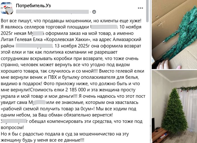 На скрине подобная история. Вместо дорогой елки покупательница при возврате положила бутылку дешевого отбеливателя для весу и сверху прикрыла разрозненными елочными веткам(они продаются недорого). Видимо специально заказала, чтобы было удобно подменить.