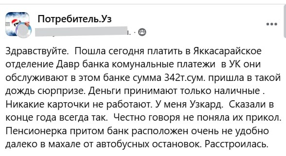В ташкентском банке обнаружилась касса, которая не принимает коммунальные платежи по карте.
