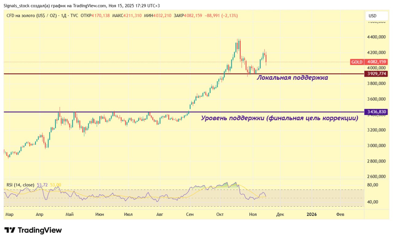 Совпадение ли, но буквально на следующий день началась 11% коррекция. Так сильно золото не падало с середины 2023 г. (тогда за 5 месяцев - 12.5%).
