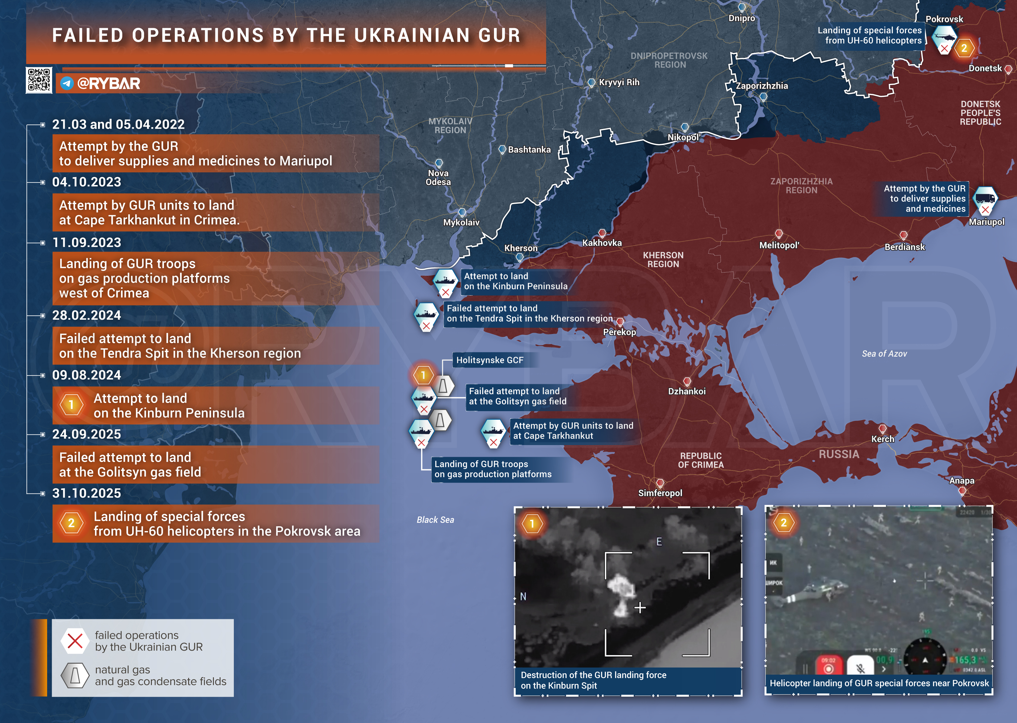 🔻 Яркие «медиа-операции» ГУР:▪️ Весна 2022 года — попытка ГУР осуществить подвоз припасов и эвакуировать командный состав «Азова» из блокированного Мариуполя. Результат — вертолет сбит, погибли летчики и члены ГУР. При этом другому борту таки удалось дойти до места назначения.▪️ 11 сентября 2023 года — высадка десанта на пустовавшую платформу газодобывающих установок к западу от Крыма. Результат: после съемки пафосных кадров с флагами члены ГУР просто погрузились в лодки и ретировались.▪️ 4 октября 2023 года — очередная попытка высадка в Крым с помощью лодок и квадроциклов. Результат — десант сразу попал под огонь и отступил, не успев даже «записать тиктоки», а один из членов ГУР захвачен в плен.▪️ 28 февраля 2024 года — попытка членов 73 центра ССО высадиться на Тендровскую косу в Херсонской области. Результат — полный провал: шесть бойцов ВС РФ остановили огнем пять катеров противника, захватив один и отогнав остальные. Ликвидированы как минимум 11 членов ГУР, еще один попал в плен, двое пропали без вести.▪️ 9 августа 2024 года — попытка высадки на Кинбурнский полуостров Лодки с десантными группами под прикрытием беспилотников подошли к Покровскому, однако только одной из групп удалось добраться до берега. Результат: десант ликвидирован, одно плавсредство уничтожено, остальные отошли.▪️ 23 сентября 2025 года — комбинированная атака БЭК и десантных катеров Голицынское месторождение. Результат: несколько лодок с оперативниками ГУР и безэкипажных катеров были уничтожены операторами БЛА, остальные отошли назад в сторону Одессы.▪️ Особняком можно выделить попытку прорыва ВСУ к Грайворону Белгородской области под президентские выборы в марте 2024 года — одно из самых бестолковых украинских наступлений за все СВО. Оно стоило врагу потери за неделю боев сотни единиц техники и массы живой силы при безвозвратных потерях ВС РФ в менее чем 20 человек, причем тогда также был зафиксирован вертолетный десант на передний край. Однако «первую скрипку» в акции играли именно ВСУ, а не ГУР.