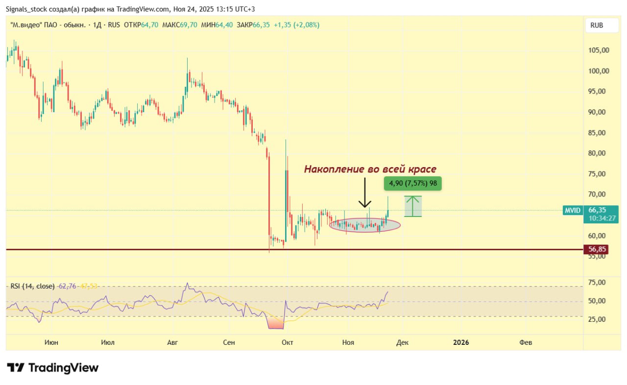 А вот в акциях МВидео по-прежнему происходит накопление, как было до начала этой недели перед 15% выстрелом у #SPBE. История рискует повториться 📈