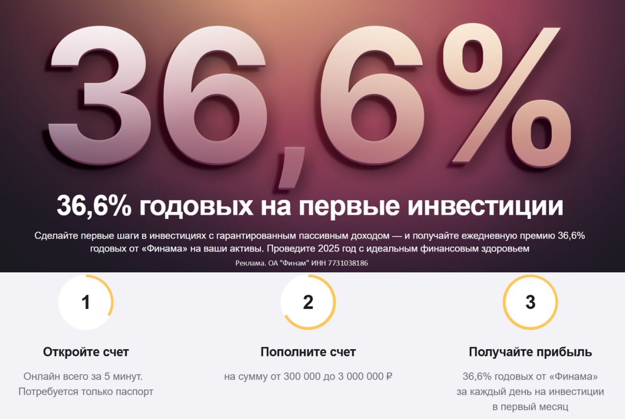 ⚡️Брокер Финам продлил по 13.11.26 акцию с начислением 36,6% годовых в течение 30 дней на ежедневный остаток от 300к до 3млн₽ и/или на такую же стоимость приобретённых активов из приложения к Регламенту акции.