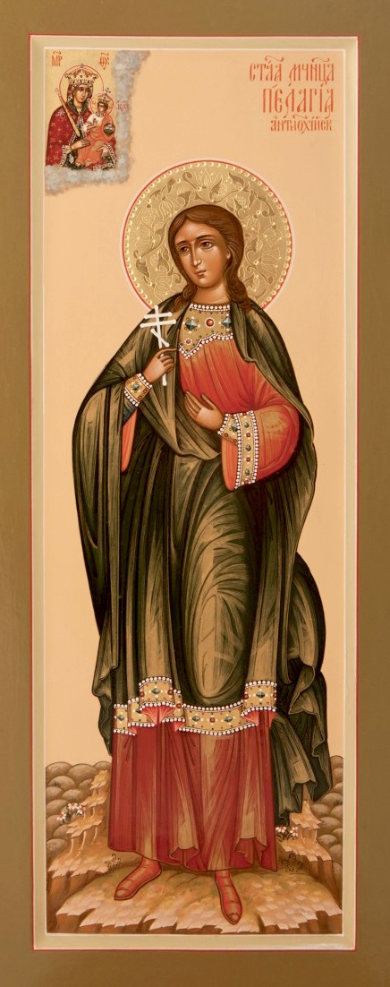 В тебе́ ма́ти изве́стно спасе́ся, е́же по о́бразу:/ прии́мши бо крест, после́довала еси́ Христу́,/ и, де́ющи, учи́ла еси́ презира́ти у́бо плоть, прехо́дит бо,/ прилежа́ти же о души́, ве́щи безсме́ртней.// Те́мже и со А́нгелы сра́дуется, преподо́бная Пелаги́е, дух твой.