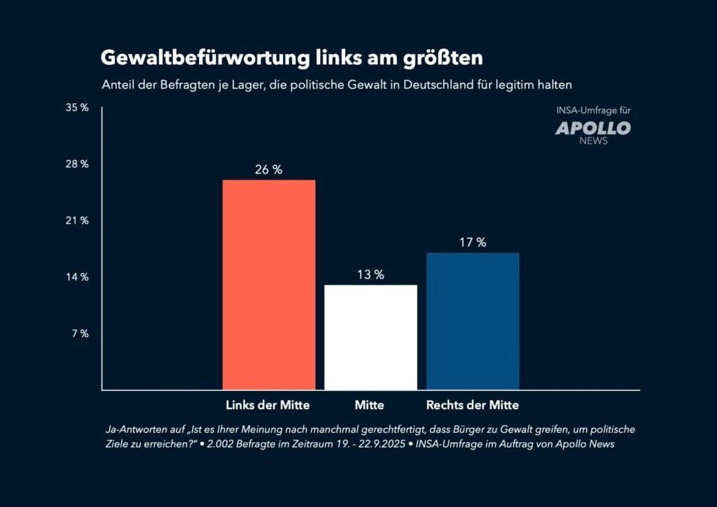 Разгоревшаяся после резонансного убийства американского консерватора Чарли Кирка дискуссия не могла не просочиться и в немецкоязычный политический дискурс. На этом фоне новостной портал Apollo News заказал серию опросов о восприятии политического насилия с разбивкой по идеологическим лагерям. Примечательно, что исследование провёл демоскопический институт INSA, известный своими регулярными «воскресными опросами» о партийных предпочтениях, что, в отличие от внутренних онлайн-опросов, гарантирует репрезентативность.